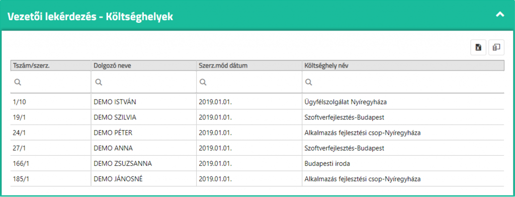 Customizable queries: Absences, administrative data, hours worked, contact details, fixed-term contracts, check-ins and check-outs, cost centers, and language skills